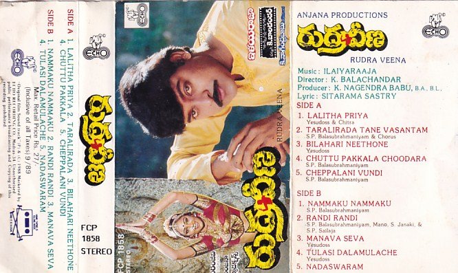 Rudraveena's soundtrack was released under Ilaiyaraaja's Echo Recording Company through double LP and cassettes. [5] [6] Each side of an LP consisted of six songs in an album, totally twelve in number; three instrumental tracks that were not titled which are performed in Nadaswaram (one being a rendition of the devotional song "Raghupati Raghava Raja Ram") were also included. [5] Aditya Music which acquired the digital distribution rights from Echo, released the soundtrack through digital providers which consisted only nine songs, excluding the instrumental tracks. [7]