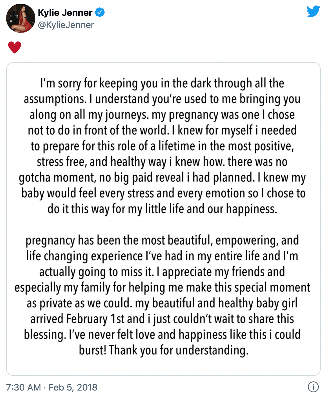 许是因为消息泄露瞒不住了,还在孕期的Kylie 索性选择了主动分享:
