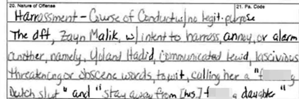 ▲ 根据外媒获得的法庭文件显示,发生冲突时,Zayn将Yolanda推倒在梳妆台,并且用污言秽语辱骂她,还怒斥了Gigi和前来劝架的安保。