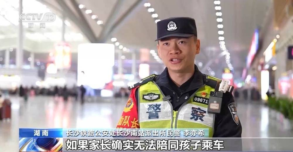 长沙铁路公安处长沙南站派出所民警 李亦希:如果家长确实无法随行,务必委托成年亲友陪伴乘车,绝对禁止让孩子自行购票乘车。由于车站站台较多,车辆密集,相邻站台可能同时停靠列车,极易发生上错车或走失等情况,途中如有紧急情况,要立即寻求铁路民警和铁路工作人员帮助。
