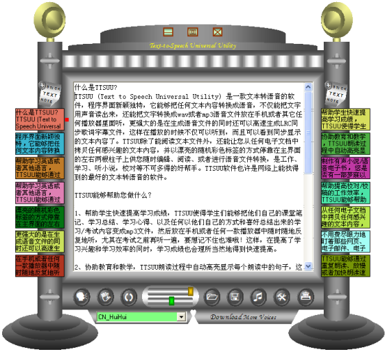 TTSUU自2012年2月发布第一个版本1.0以来,持续研发,已经升级到1.75版,完全开发SAPI接口,也能自动识别和使用第三方的语音引擎。