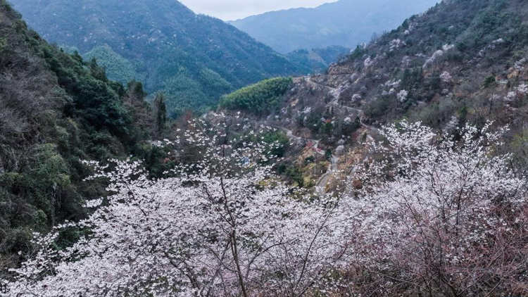 近日,浙江省建德市三都镇数万亩野生樱花进入盛花期,以“天路寻樱·山野赴春”为主题的2026建德三都春季山花旅游季活动在前源村盘山公路核心赏樱区开启。漫山遍野的粉色、白色野樱花次第绽放,将山乡装点成春意盎然的美丽画卷,吸引众多游客前来打卡。