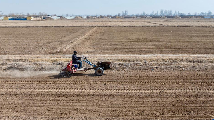近日,宁夏银川市贺兰县的农民积极开展小麦春耕备耕,田间地头一片繁忙的景象。