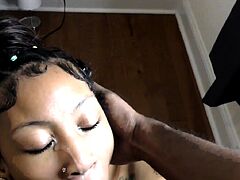 Young black cigarette smoker in lingerie gives an awesome interracial blowjob