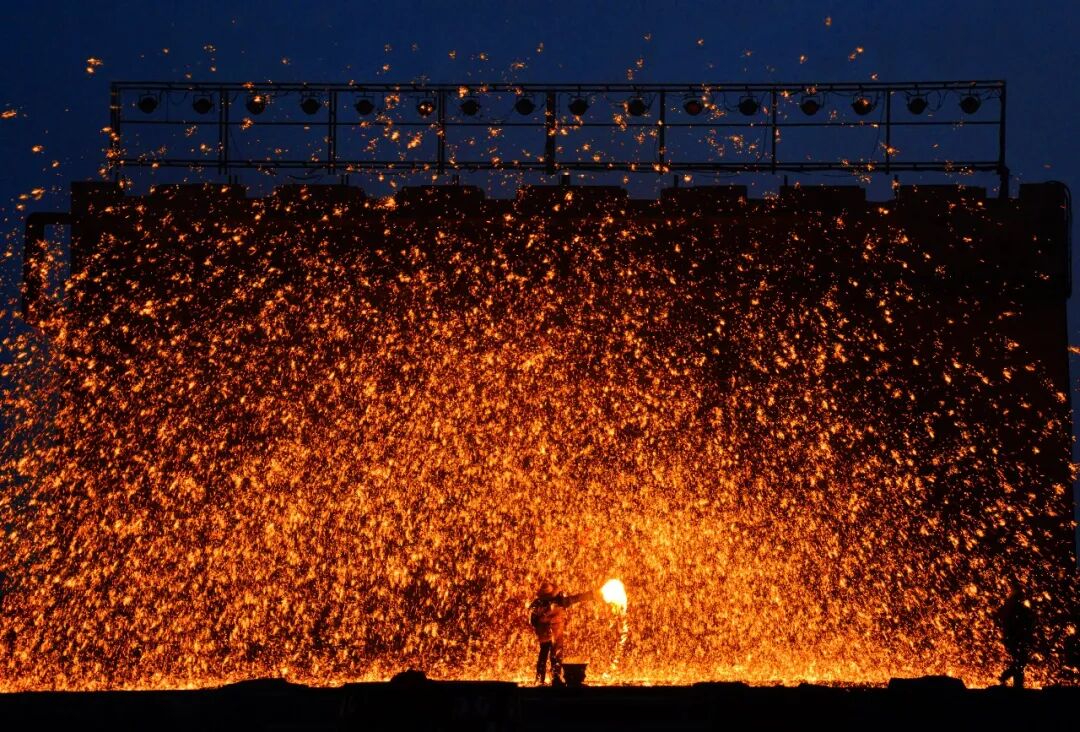 在河北蔚县,暖泉古镇延续了500多年的“打树花”绝技,匠人们将1600多度的铁水泼洒向城墙,瞬间炸裂成万朵金花,照亮冬夜。