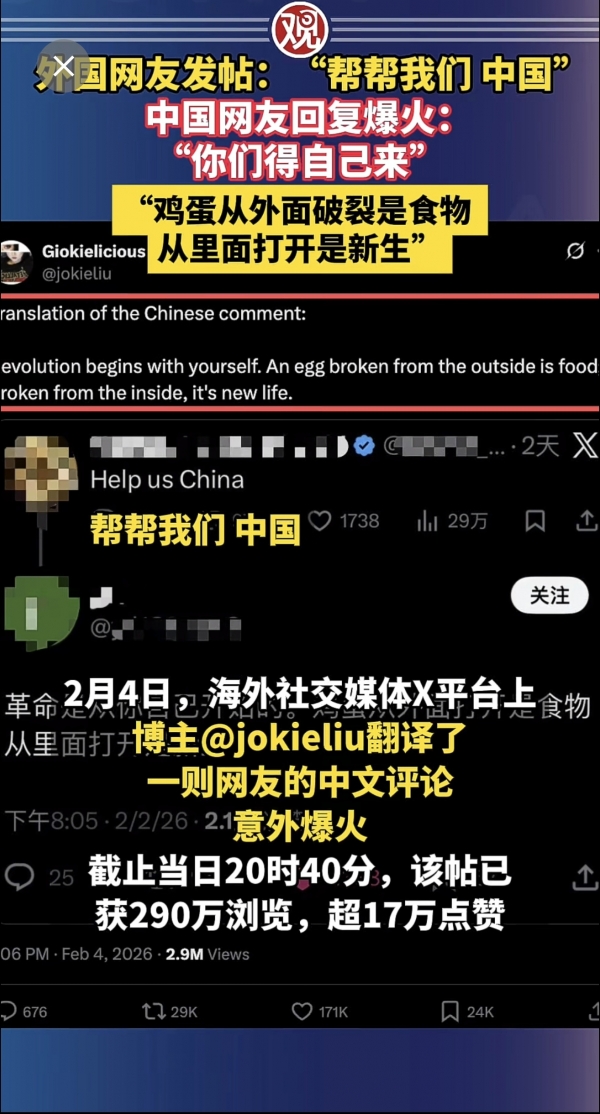 就有位中国网友随手留了句:"鸡蛋从外面打开是食物,从里面打开是新生",没成想这简单的一句话,直接让外网评论区炸了锅。