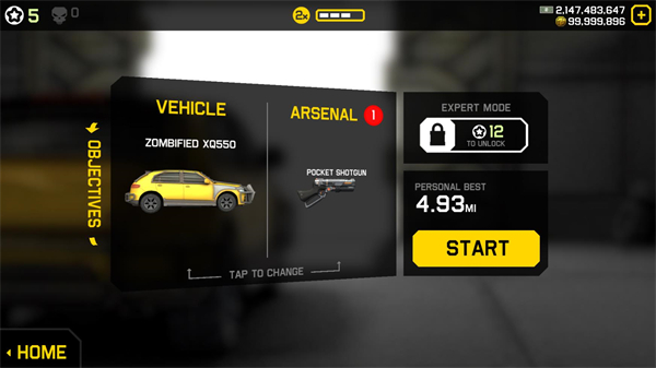 2、点击后可以选择不同的车辆和武器进行闯关,点击start就可以正式开始。