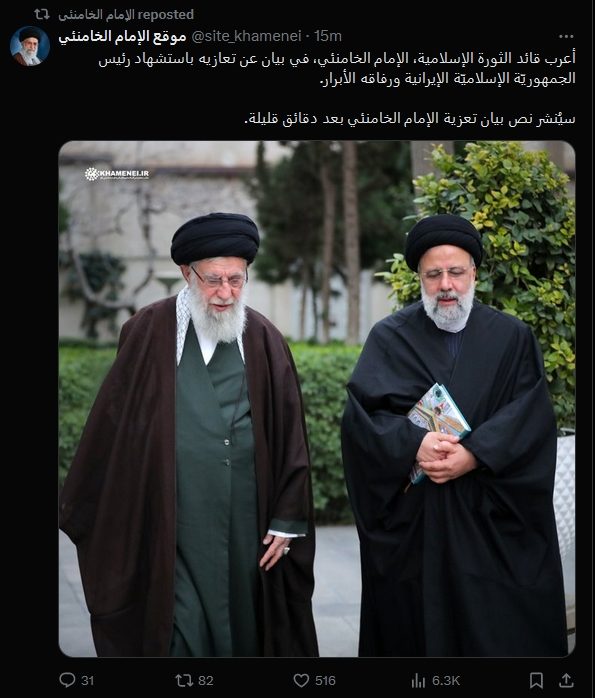 哈梅内伊的社交媒体X(原推特)账号20日发布帖文,并配上了一张他和莱希的合照。帖文写道:"伊斯兰革命最高领袖伊玛目哈梅内伊在一份声明中对伊朗伊斯兰共和国总统及其光荣战友的殉难表示哀悼。"