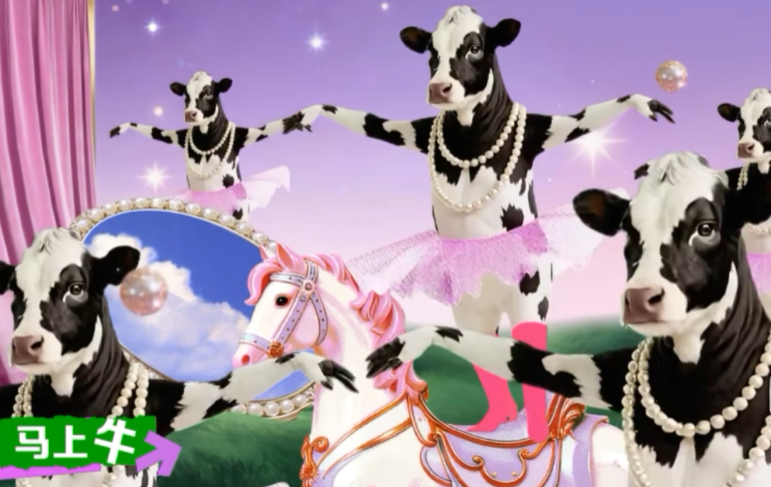 你见过穿着芭蕾舞裙戴着珍珠项链的奶牛,站在马背上吗?现在你见到了。