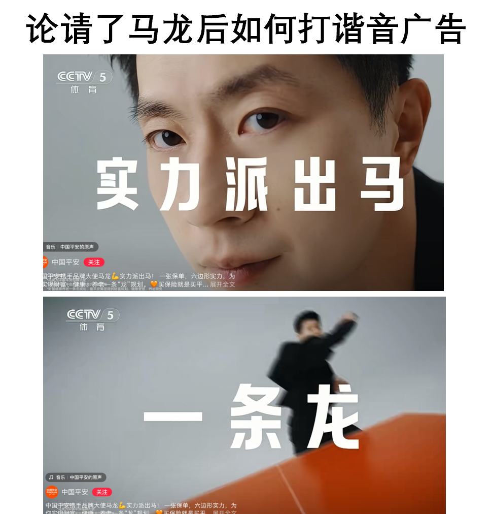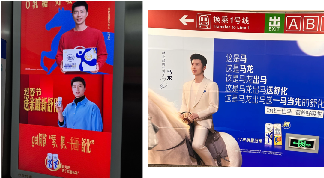 今年我看的最癫的是马龙和舒化奶的广告。左边为了表达“过年送亲戚舒化奶”,运用了“琴棋书画”的谐音,好破啊!右边则是让马龙骑着马,来了一段主谓宾诗歌。