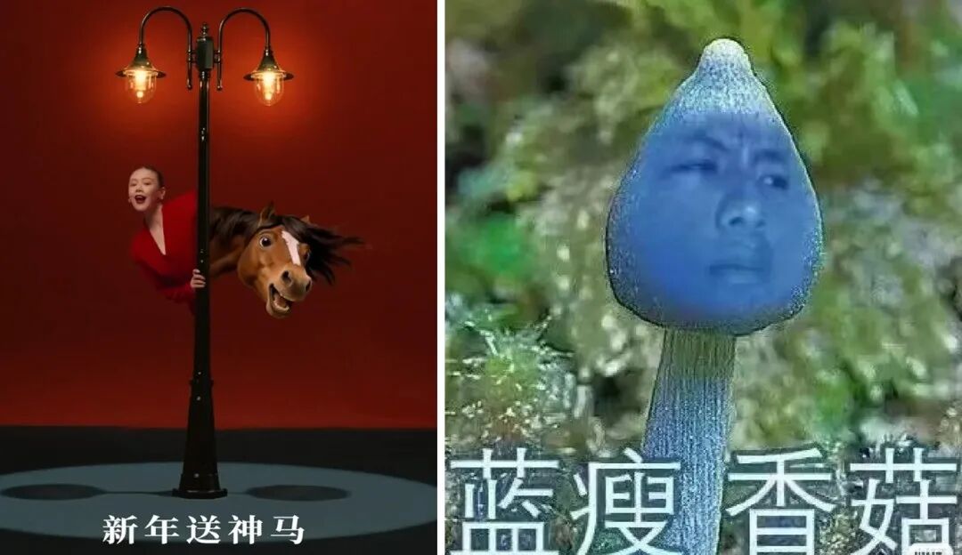 三匹马只是开胃菜,后面还有好多马和马思纯,感觉剪辑师在这里用了好多ctrl+C和ctrl+V。短短的动图就有“马年要红”“horse连连”等谐音梗。