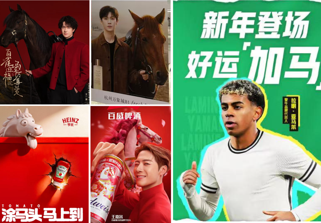 鉴于姓马的明星很有限,所以也有很多不管三七二十一直接加点马再说的广告,不管是护肤品还是啤酒还是番茄酱,全都有马,放眼望去就是马的全家福啊!甚至国外的球星亚马尔也请过来了,音译过来有马也行,西洋马也是马啊!