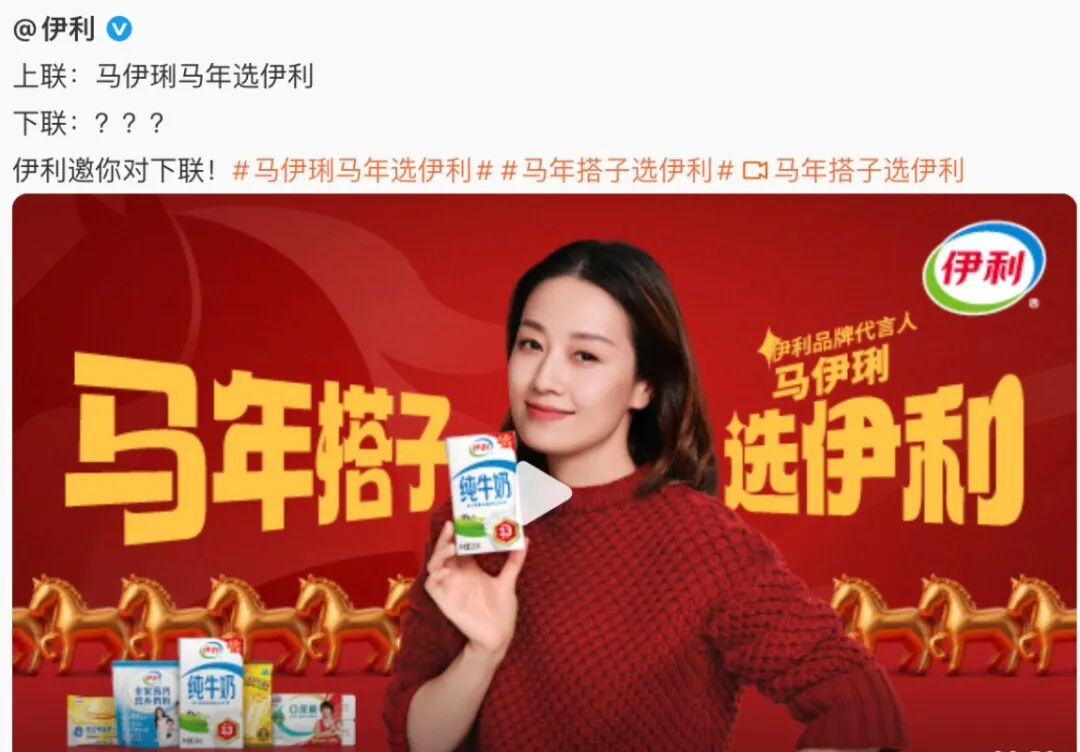 首先就是伊利马年请了马伊琍,名字起得好是真能接到商务啊!到这里还很合理!伊利还出了对联,上联是马伊琍马年选伊利,有网友对出了下联:真牛马马年当牛马。好诗好诗!