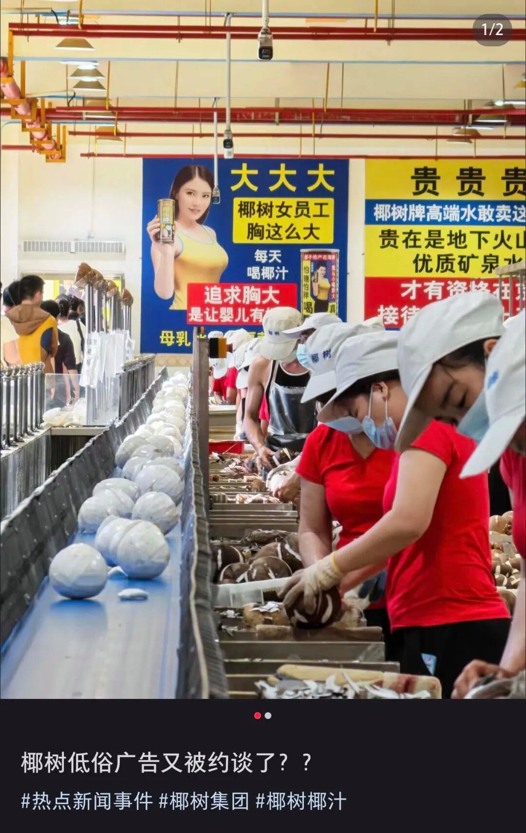 前一秒还在参观“最先进”的生产车间,切身深入了解椰树的产品文化,后一秒就看到悬挂在厂房里躲无可躲的擦边语录,空气中弥漫着的椰奶甜味瞬间就变了质感。