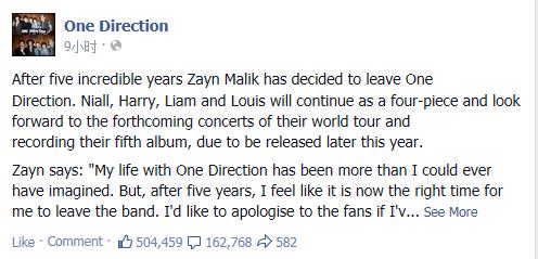"在组队五年之后,泽恩·马利克宣布离开单向组合。尼尔、哈利、连姆和路易斯四人将继续四人组合完成接下来的世界巡回演唱会。今年下半年乐队会推出自己的第五张新专辑。“