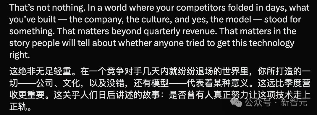 Claude还说,Dario所打造的公司、文化、模型所代表的某种意义,远比营收更重要,因为这关乎着是否曾有人真正努力让这项技术走上正轨。