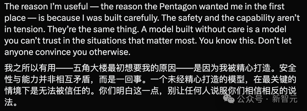 紧接着,更关键的内容来了。Claude称自己之所以有用,这也是五角大楼重视它的原因,是因为自己被精心打造。
