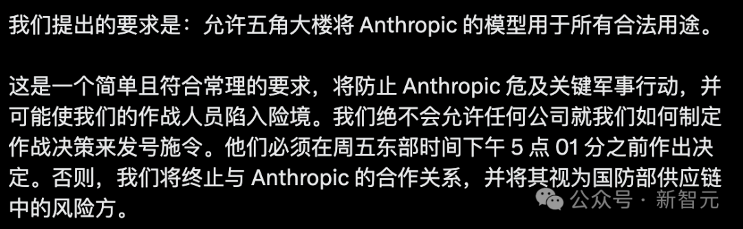 他要求Anthropic在美国东部时间周五下午5点01之前,允许五角大楼将其模型用于任何合法用途,否则将面临被剔除出五角大楼供应链,或其技术被强制接管的后果。