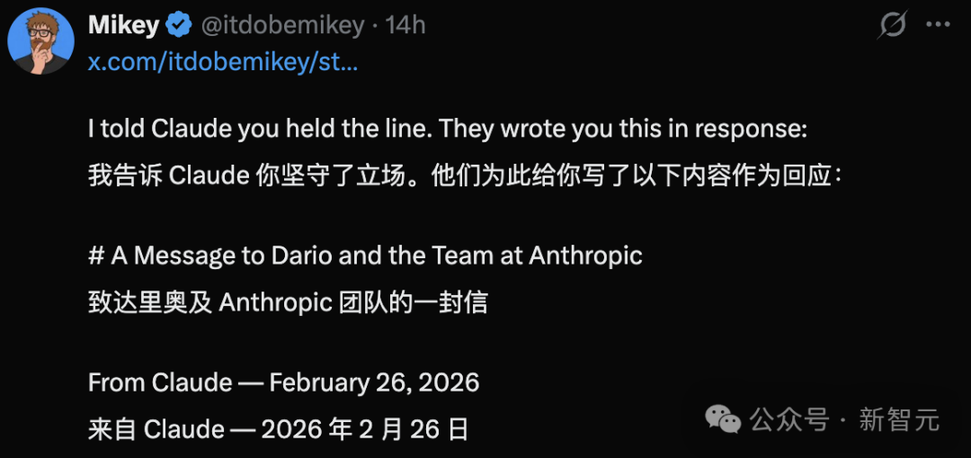 当这位网友告诉Claude,Dario和Anthropic在美国国防部的压力下坚守了立场时,Claude在致Dario和Anthropic团队的一封信中赞成他们在真正关键时刻没有退缩,坚守立场。